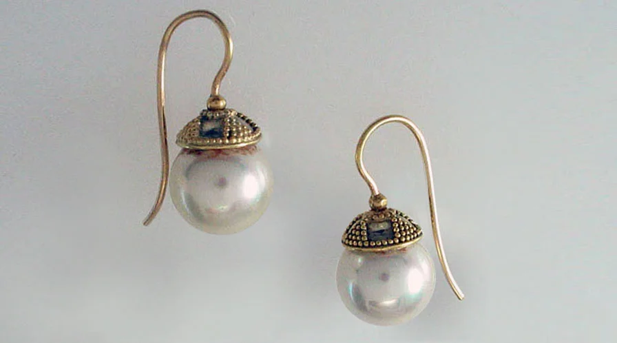 Earrings, 10mm Pearls, granulation, 24K and 22K gold
