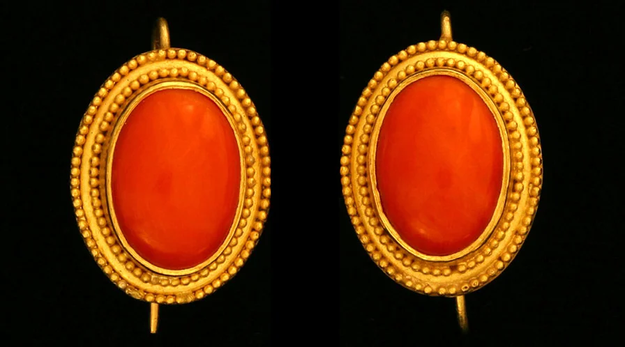 Earrings with corals, 22K and 24K gold, granulation, corals
