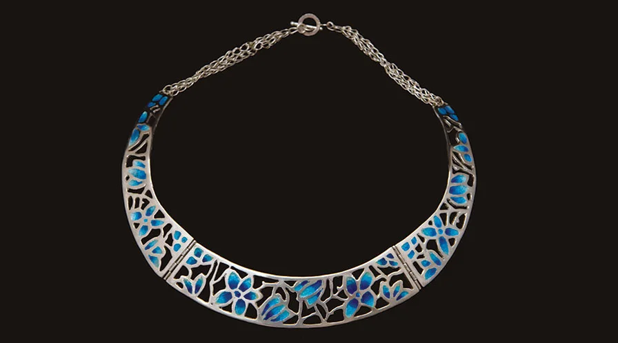 Silver necklace, champlevé enamel with pearl